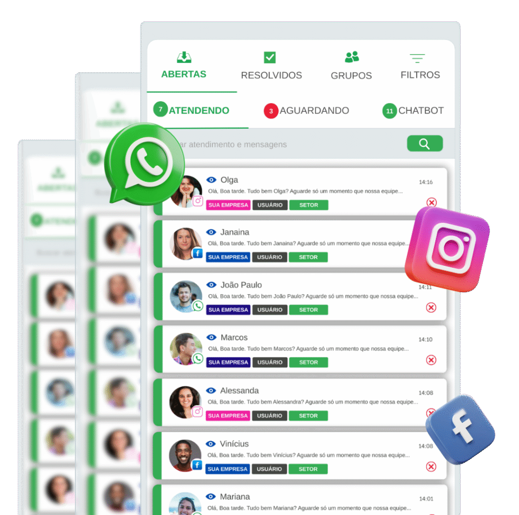 Uma plataforma completa para gestão de atendimentos via WhatsApp, Instagram e Facebook em um só lugar, com recursos como chatbot inteligente, multiatendimento, envios em massa e relatórios detalhados para que sua empresa ganhe agilidade e organização nos atendimentos. Tudo isso 100% online, fácil de usar e integrado às principais ferramentas do mercado.